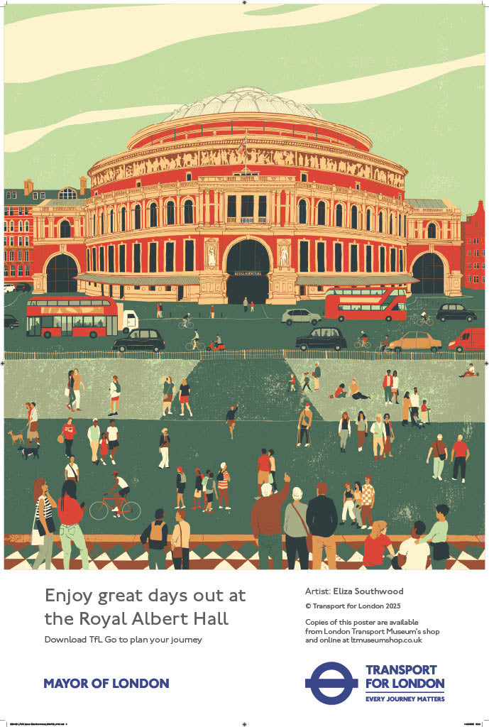 Commissioned by London Transport Museum in collaboration with TfL, the third poster of the ‘Great days out’ series features the Royal Albert Hall.